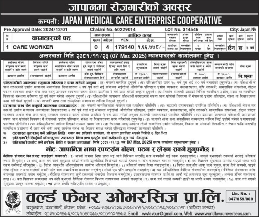 If this role is your calling, save the date for these jobs in Japan for Nepali citizens! The last interview for this position is in Kathmandu (07 March 2025) at the World Favour Overseas PVT. LTD office. The opportunity Company representatives want to talk to you about the position and the work environment. Your opportunity does not just end when you are accepted; you must prepare well for the interview. Thanks to your interview, your admission into this fascinating new opportunity is assured.