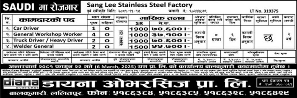 The last interview for those who wish to apply for the Jobs in Saudi Arabia for Nepali will be conducted on March 6, 2025, in Kathmandu at Diana Overseas Private Limited Manpower Office. Now is the time to forward your calendar and make plans to prepare your application for the interview.